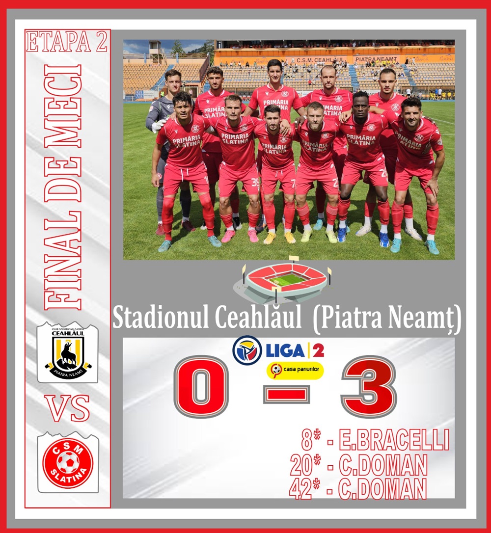 Victorie categorică pentru echipa lui Dan Oprescu, scor 3 la 0, în cea de-a doua etapă a Ligii a II-a, etapă în care slătinenii au disputat duelul cu Ceahlăul Piatra Neamț. Meciul a fost deschis de golul lui Bracelli, care a înscris în minutul 8. Ulterior, echipa slătineană și-a continuat dominația prin căpitanul de echipă Cătălin Doman, care a marcat de două ori, în minutele 20 și 42. Cu această victorie, CSM Slatina ajunge la 4 puncte acumulate în primele două etape ale noului sezon.